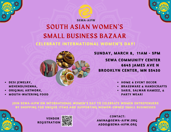 Join us for a vibrant celebration of International Women's Day at the South Asian Women's Small Business Bazaar! Discover unique items, support locally-owned businesses, and enjoy culture, creativity, and the best of the South Asian community. See you on Saturday, March 8th, from 11 AM to 5 PM at the SEWA Community Center, 6645 James Ave N, Brooklyn Center, MN 55430. Don't miss out on desi jewelry, home decor, mouth-watering food, and much more!