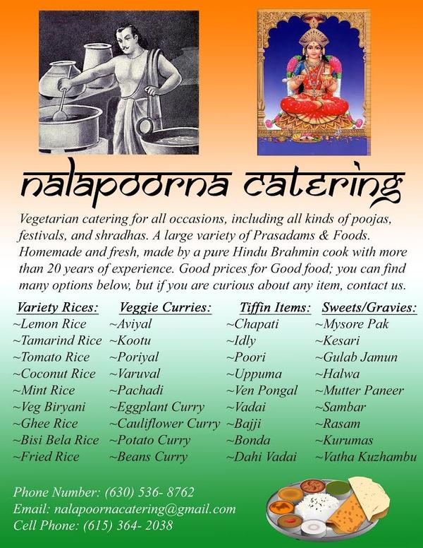Vegetarian catering for all occasions, including all kinds of poojas, festivals, and shradhas. A large variety of Prasadams & foods, made by a pure Hindu Brahmin cook with more than 20 years of experience. Good prices for good food. We have a variety of rices, curries, tiffin items, and sweets. Please contact us for any questions. Everything made fresh and homemade. Give us a call for your vegetarian food.