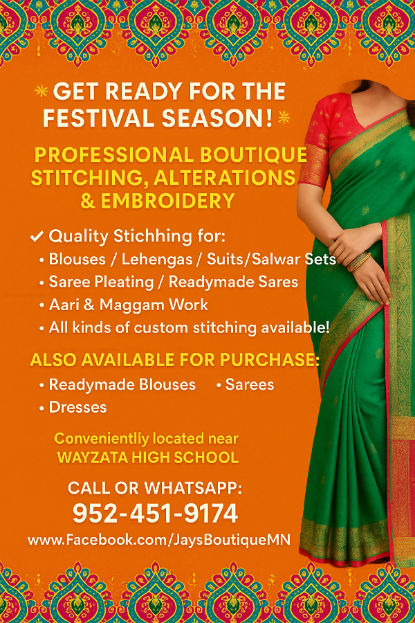 ? Get Ready for the Festival Season! ? ?? Professional Boutique Stitching, Alterations & Embroidery ? Quality Stitching for: • Blouses / Lehengas / Suits / Salwar Sets • Saree Pleating / Readymade Sarees • Aari & Maggam Work • All kinds of custom stitching available! ?? Also Available for Purchase: • Readymade Blouses • Sarees • Dresses Saree pre pleating and box folding available. Contact us today! ?? Conveniently located near Wayzata High School ?? Call or WhatsApp: 952-451-9174 ?? Facebook: Jays Boutique MN