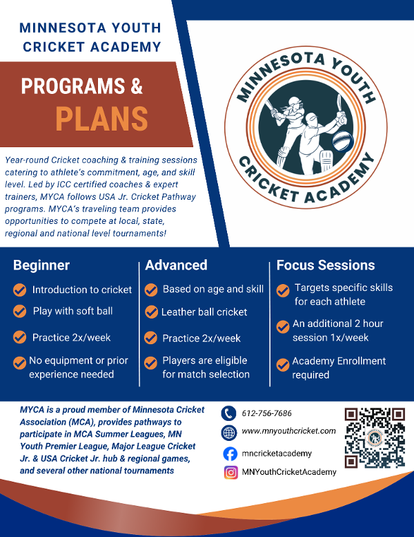 Minnesota Youth Cricket Academy (MYCA) is excited to announce continuation of the three special programs tailored for young cricketers in both Spring and Summer, catering to boys and girls alike. As Spring approaches, it's time to shed the winter blues and gear up for an action-packed cricket season ahead. Parents, there's no better time than now to enroll your children in one of our beginners (softball), introductory (leather ball), or intermediate (leather ball) programs. You're invited to sign up for a complimentary session to see if cricket sparks your children's interest and passion.